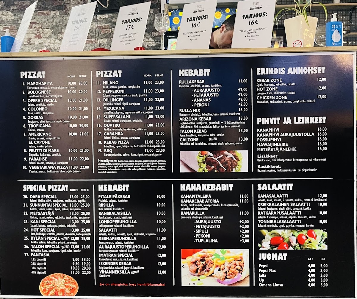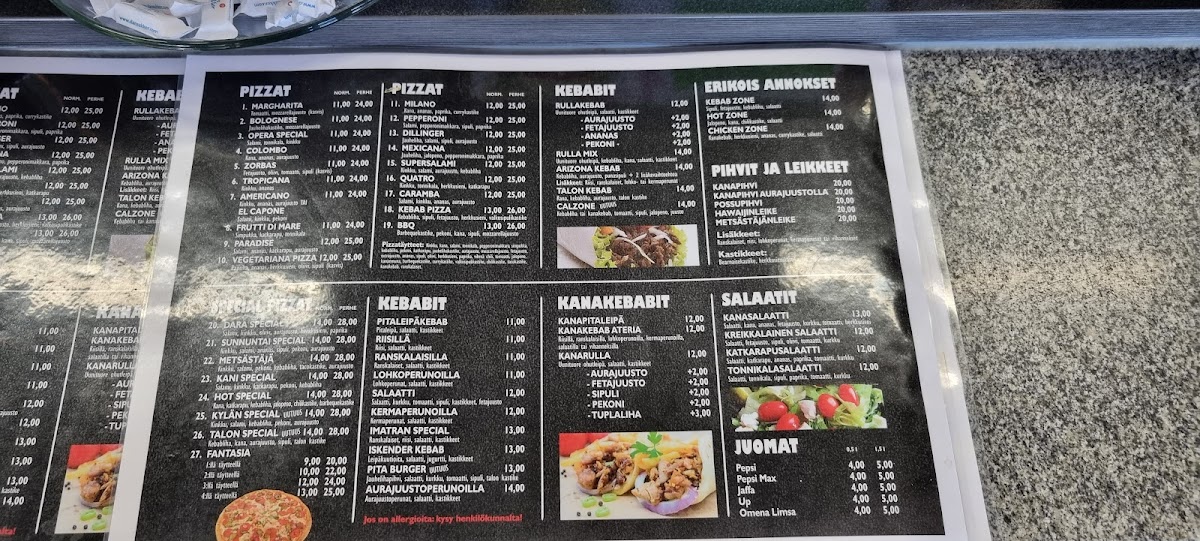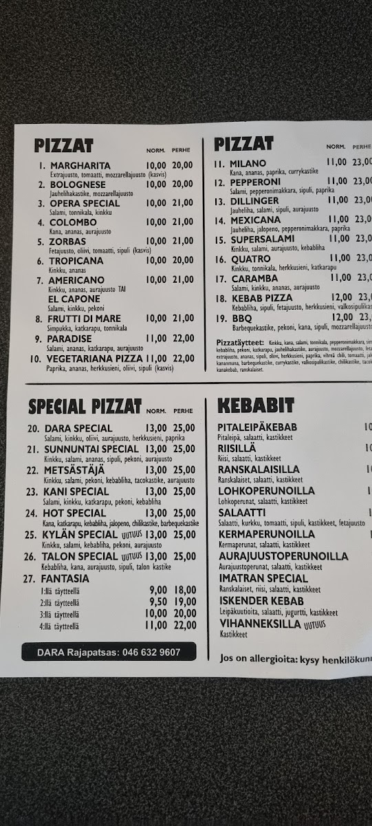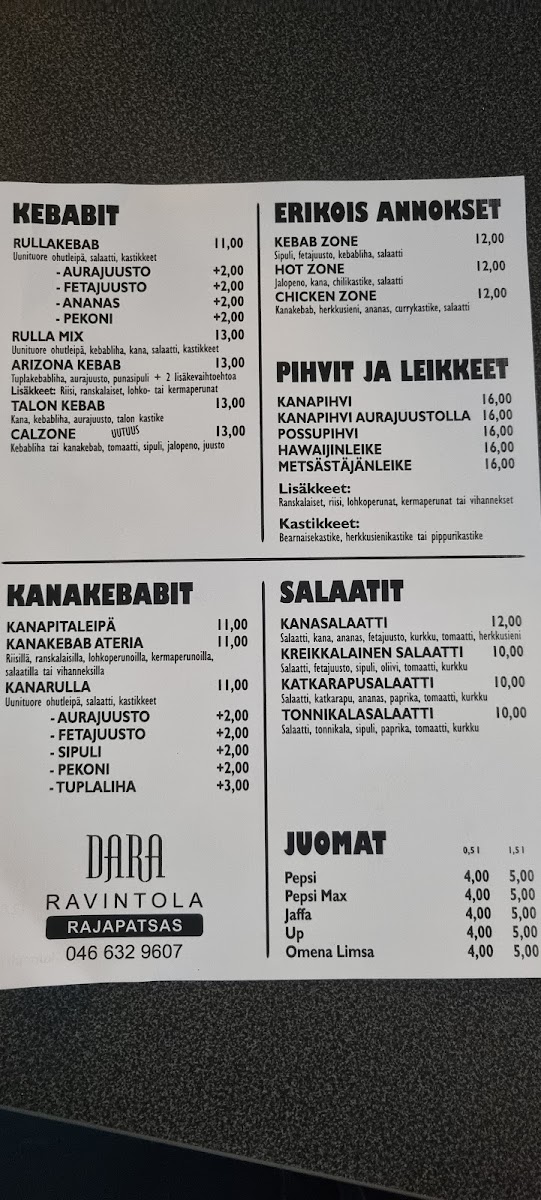 The menu at Dara Ravintola Rajapatsas offers a straightforward and inviting selection centered around pizza, complemented by casual café-style options. Visitors can enjoy a variety of comforting dishes suited for lunch or relaxed evening meals, with choices that appeal to both families and solo diners alike.